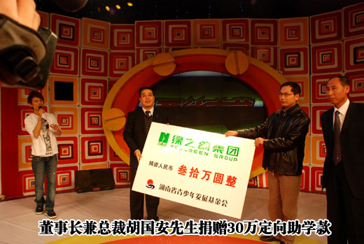 该节目联合爱心企业筹集善款为贫困山区捐赠希望小学的栏目宗旨正与安博官网公司爱心助学的理念不谋而合,引起了集团公司领导的关注,并最终促成了此次的合作,这也是该栏目首次推出湖南省外的希望小学捐赠活动。安博官网董事长兼总裁胡国安亲临节目现场将30万元现金支票捐赠到湖南省青少年发展基金会副秘书长李秋林以及孟宪臣校长手中。胡总说:“捐赠38所绿之韵希望学校是所有绿之韵人的追求,三年以来,集团公司投入在慈善公益方面的款项累计已达500多万,在以后的日子里,我们仍将不断的为各项社会公益活动奉献爱心,帮助更多需要帮助的人,在勇往直前的事业发展途中,让爱见证每一位绿之韵人的情怀。