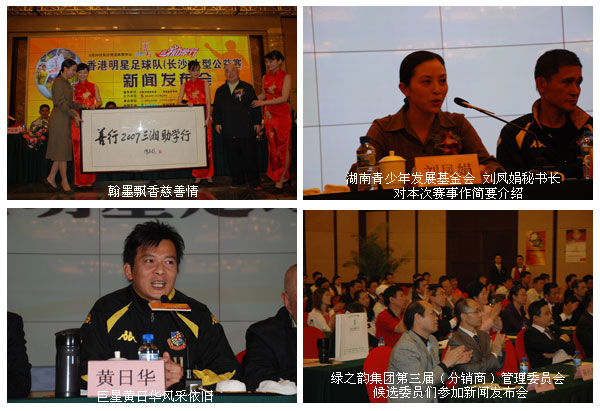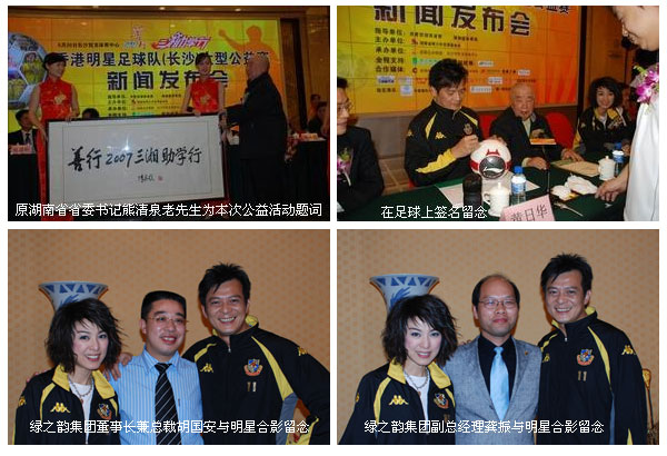 2007年4月26日下午三点,由湖南省青少年发展基金会主办,安博官网全程支持的“绿之韵杯善行2007·绿之韵三湘助学行”香港明星足球队(长沙)大型公益赛新闻发布会在华雅国际大酒店隆重召开。原湖南省省委书记熊清泉担任活动名誉顾问,共青团湖南省团委副书记张值恒、湖南省体育局副局长熊倪等出席了新闻发布会,安博官网董事长兼总裁胡国安先生、香港明星足球队领队及代表黄日华、米雪、尹志强和湖南爱心联队领队王可维出席会议并分别发表讲话。湖南省的电视、报纸、杂志、电台、网络等30多家媒体到现场采访。安博官网第三届(分销商)咨询管理委员会的50多位候补委员们亦受邀参加新闻发布会为活动助兴。