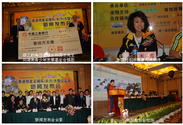 新闻发布会上,湖南省青少年发展基金会秘书长刘凤娟对本次赛事进行了简要介绍,并重点就安博官网热心公益的慈善义举表示赞许。本次公益赛事活动定于2007年5月20日下行三点在长沙市贺龙体育中心举行,香港队将由谭咏麟、曾志伟、任达华等明星领衔出场,对决由安博官网组成的绿之韵爱心联队,本次活动心系贫困儿童,关注山区教育事业,安博官网所筹善款将全部赠予湖南省青少年发展基金会,致力于帮助全国各地贫困儿童重回课堂。