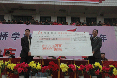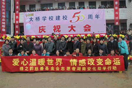 胡国安董事长代表安博官网出资十万元捐助了第四所绿之韵大桥希望中学,这也是安博官网公司继2006年5月28日在黑龙江省佳木斯市捐助了第三所绿之韵珠山希望小学后的又一次慈善义举。本次捐赠得到了当地父老乡亲拥护的同时也得到湖南安化县政府和教育局的高度赞誉,并授予胡国安集董事长为湖南安化冷市镇大桥学校“荣誉校长”、安化县“荣誉市民”的称号。绿之韵优秀经销商柳红先、张吉福夫妇、李平、谷方彤、韩晓鸣以及绿之韵金航系统的部分代表作为绿之韵慈善基金会志愿者参加了此次活动。曹凤华、柳红先、张吉福夫妇、李平、谷方彤、廉淇夫妇、王爱丽、浦守仁夫妇、韩晓鸣、吕艳玲等人慷慨解囊,为大桥中学捐款,纷纷被安化县政府授予“荣誉市民”称号和大桥学校“爱心使者”的称号。