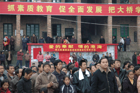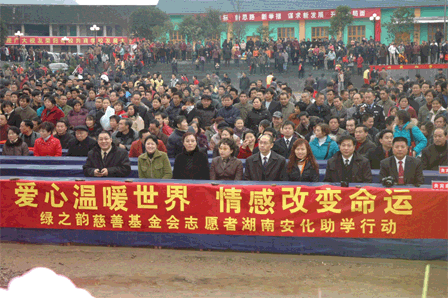 12月8日,安博官网董事长胡国安先生在百忙之中亲自带队,车行数百公里连夜赶往湖南安化冷市镇,同行的还有:陈社行总经理、劳嘉副总经理、董事长助理马艳和数百名绿之韵慈善基金会志愿者,他们给当地的乡亲们送去的不仅是绿之韵人的关爱还有十万元的捐赠款。安化是胡国安董事长的家乡,虽少小离家,但他对这片生养的故土有着深深的乡情,胡国安董事长一直把回报家乡作为自己的一个心愿。对于安化冷市镇大桥中学的师生们而言,今天让他们倍感欣喜,因为这一天不仅是大桥学校五十周岁的生日,而且绿之韵公司的雪中送炭将解决乡亲们的一块心病。大桥中学是当地唯一一所可以容纳安化冷市镇的学龄儿童就读的学校,但在几十年的风雨飘摇中,因为资金贫乏得不到及时的修缮,目前教学环境已是破旧不堪,岌岌可危,让家长们提心吊胆。在寒风细雨中,胡国安董事长带着绿之韵人的爱回来了,向家乡人伸出援助之手,当地数千名乡亲闻讯都赶到了现场观看隆重的捐赠仪式。