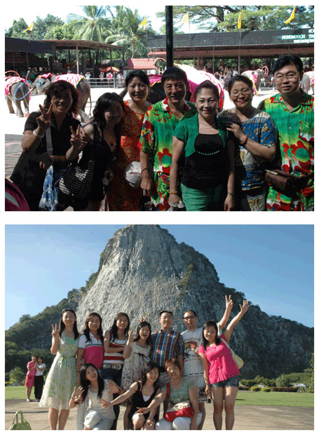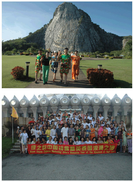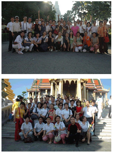 此刻正是泰国一年中气候最宜人的凉季,金碧辉煌、璀璨夺目的“大皇宫”,古色古香的泰国第一国宝:有着二千年历史的玉佛寺,其雄伟壮观,让所有的绿之韵精英大开眼界。旅游途中,观行宫、游湄南河、欣赏精彩刺激的人蛇表演,在泰国旅游局指定的皮革加工厂,珠宝展示中心精心挑选礼物,乘太平洋上的东方公主号豪华游艇夜游,观看妖娆艳丽的人妖表演,享用丰盛的海鲜大餐……泰国异域风情令绿之韵的精英们流连忘返,乐在其中。