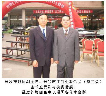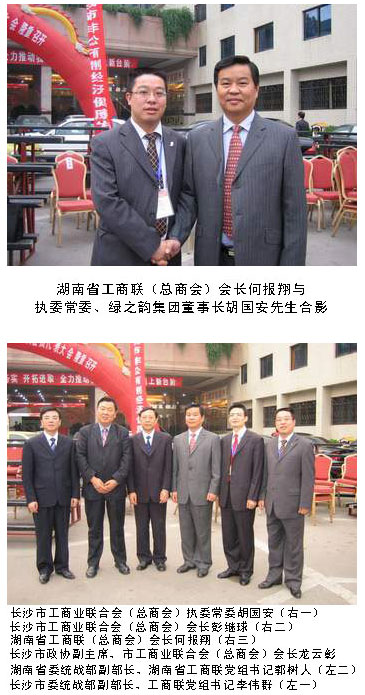 2006年11月15—16日,绿之韵国际集团董事长兼总裁胡国安先生参加了长沙工商联、非公有制经济界五年一次的盛会——长沙市工商业联合会(总商会)第十二次会员代表大会。中共湖南省委副书记、长沙市委书记梅克保、湖南省委统战部副部长、湖南省工商联党组书记郭树人、湖南省工商联(总商会)会长何报翔、中共长沙市委副书记吴志雄、长沙市人民政府常务副市长向力力、长沙市政协副主席、长沙市工商业联合会(总商会)会长龙云彰、长沙市委统战部副部长、工商联党组书记李伟群、长沙市工商业联合会(总商会)会长彭继球、长沙市政协副主席、工商联(总商会)副会长龚振湘等领导出席了本次会议并发表精彩讲话。