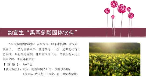 “黒耳多酚固体饮料”中的黑木耳被誉为“素中之王”,是补血的良药。黒耳多酚中所含的茶多酚能够阻挡紫外线和清除紫外线诱导的自由基,从而保护黑色素细胞的正常功能,抑制黑色素的形成,使肌肤显得白嫩起来。同时,茶多酚对脂质氧化产生抑制作用,减轻色素沉着,延缓机体衰老。