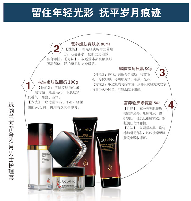 TIPS:留金岁月男士护理套装适合干性、中性的男性皮肤使用。能深层清除污垢、补充养分,迅速补水,软化、溶解老化坏死细胞,净化肌肤;补充养分和水分,修护肌肤,恢复弹性。