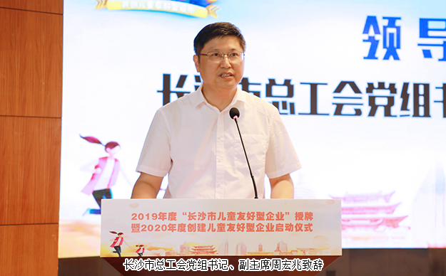 活动伊始,长沙市总工会党组书记、副主席周宏兆致辞。他首先代表长沙市总工会向各位领导、来宾的莅临表示欢迎,并向全市青少年儿童致以节日的问候。他表示,2019年,长沙市自然资源和规划局、市教育局、市妇联联合出台《长沙市创建“儿童友好型城市”三年行动计划(2018-2020年)》,围绕政策友好、空间友好、服务友好三个方面,推出创建儿童友好型城市十大行动、42项任务,努力保障少年儿童在星城长沙健康快乐茁壮成长。这其中涌现出了一批长期致力于服务儿童、关心关爱职工子女,积极开展扶贫助学、保障儿童权利的企业。他向首批获得“儿童友好型企业”称号的企业代表们予以祝贺,希望获奖企业能继续服务好职工子女,积极参与公益事业,为长沙市儿童友好型城市建设贡献出企业力量。