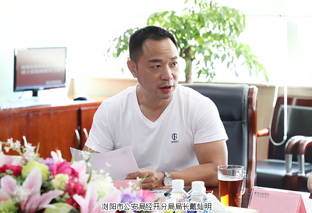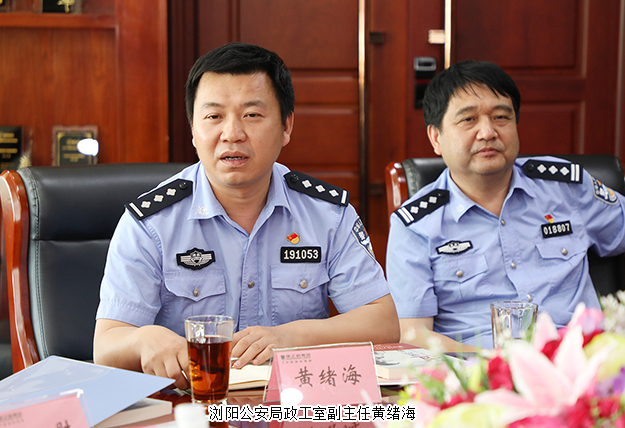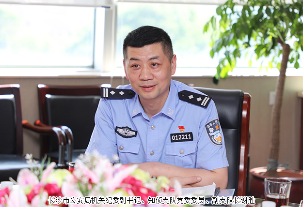 2020年5月19日,长沙市公安局机关纪委副书记、知侦支队党委委员、副支队长谢胜一行莅临安博官网调研指导。浏阳公安局政工室副主任黄绪海,浏阳市公安局经开分局局长戴灿明、教导员罗泽怀,安博官网董事总裁劳嘉,长沙市公安局特邀形象监督员、安博官网副总裁胡均安,安博官网党委书记刘云、副书记许达仲等领导全程陪同。