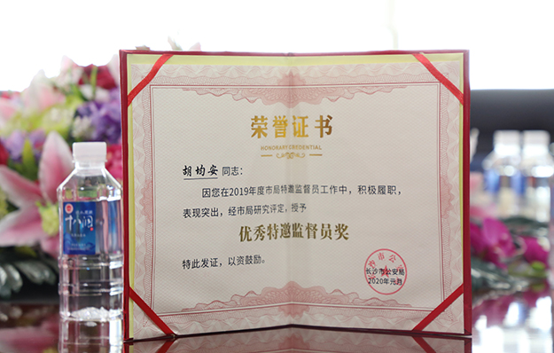 调研期间,长沙市公安局机关纪委副书记、知侦支队党委委员、副支队长谢胜向特邀监督员简要汇报了2020年第一季度长沙市公安局主要工作:2020年是长沙公安的“社会治理创新年”“数据警务深化年”和“保障体系优化年”,一季度市局工作主要围绕“战役情,保平安,体现长沙公安担当;提能力,强队伍,全面从严管党治警;严打处,提服务,维护社会治安稳定”三个方面开展,取得了一定的成果。他表示,建立特邀监督员制度是长沙公安机关以开放的姿态主动接受外部监督的一项重要举措,从这一年多时间的实践来看,各位特邀监督员能够主动履职尽责,积极建言献策,充分发挥了群众基础好、业务水平高、实践经验丰富等优势,从第三者的视角弥补了纪检机关的监督盲区,为长沙公安队伍建设提出了许多宝贵的意见建议。座谈会上,市局机关纪委副书记、知侦支队党委委员、副支队长谢胜向胡均安副总裁颁发了“优秀特邀监督员”荣誉证书。