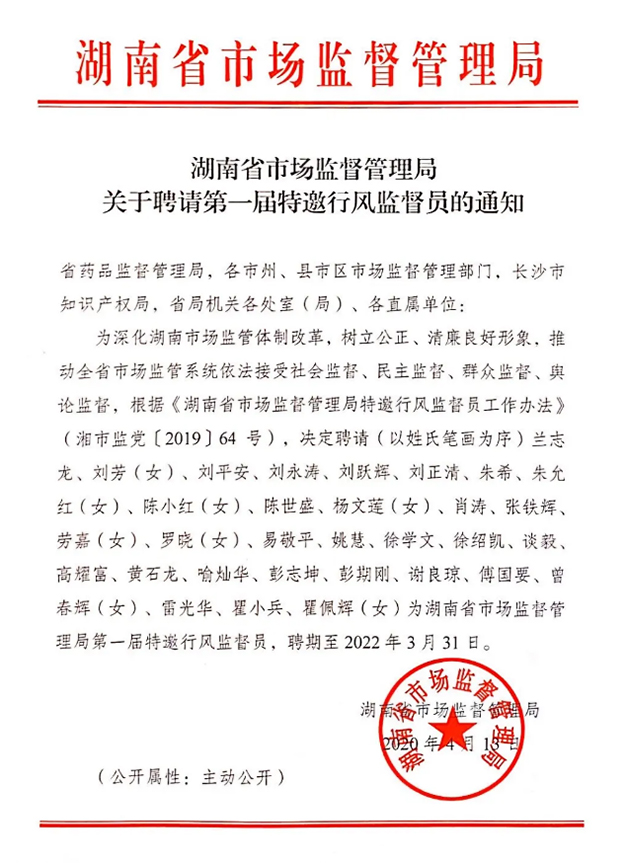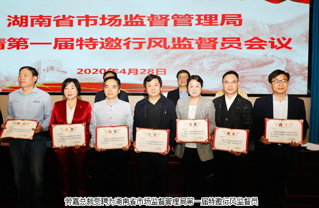 受聘为湖南省市场监督管理局第一届特邀行风监督员,劳嘉总裁表示:特邀行风监督员这个聘书沉甸甸的,不仅是一种光荣,更有一种神圣的使命感和责任感。我一定不辜负省市场监督管理局的期望,不辜负广大民众的重托,争做称职的、优秀的监督员,并充分发挥好参谋咨询、桥梁纽带、舆论引导作用,依法依规履行市场监管系统行风建设监督职责,为新形势下市场监督工作建言献策,为我省市场监管工作和队伍建设作出积极贡献。