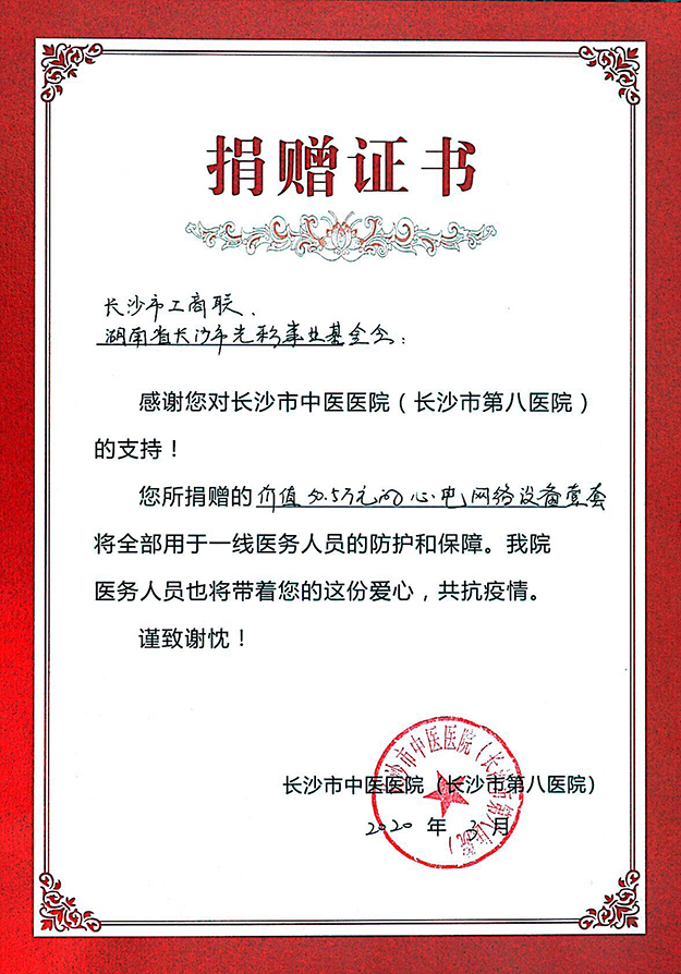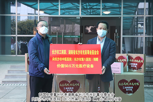 湖南省长沙市光彩事业基金会理事长、安博官网董事长胡国安代表湖南省长沙市光彩事业基金会向长沙市中医医院(长沙市第八医院)捐赠价值50.5万元心电网络设备。长沙市中医医院(长沙市第八医院)党委副书记、院长周继如代表医院接受捐赠物资,他表示:自疫情发生以来,医院全体干部职工积极投身抗击疫情第一线,全力以赴、尽职履责、严防死守,和时间赛跑,与病毒作战,充分展现了医务工作者强烈的使命担当。社会各界爱心人士源源不断的捐赠,通过各种方式支援防控工作,让广大医务工作者深受鼓舞、倍感温暖,这些爱心和善举将汇聚成打赢新冠肺炎疫情阻击战的磅礴力量。
