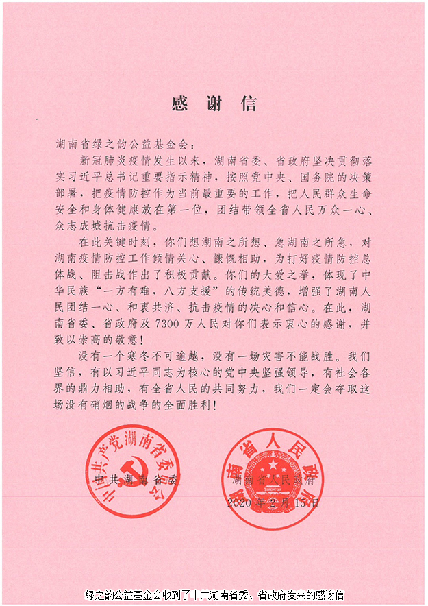 在听取完劳嘉总裁的工作汇报后,湖南省政协副主席、致公党湖南省委主委胡旭晟及调研组一行对绿之韵的疫情防控举措落实工作表示了充分肯定,对绿之韵积极向湖北湖南抗击疫情捐赠爱心款物助力抗疫所表现出来的社会情怀和高度责任感给予了高度赞誉和评价。近日,绿之韵公益基金会收到了中共湖南省委、省政府发来的感谢信,信中充分肯定绿之韵为全面打赢疫情防控人民战争、总体战、阻击战作出的积极贡献。