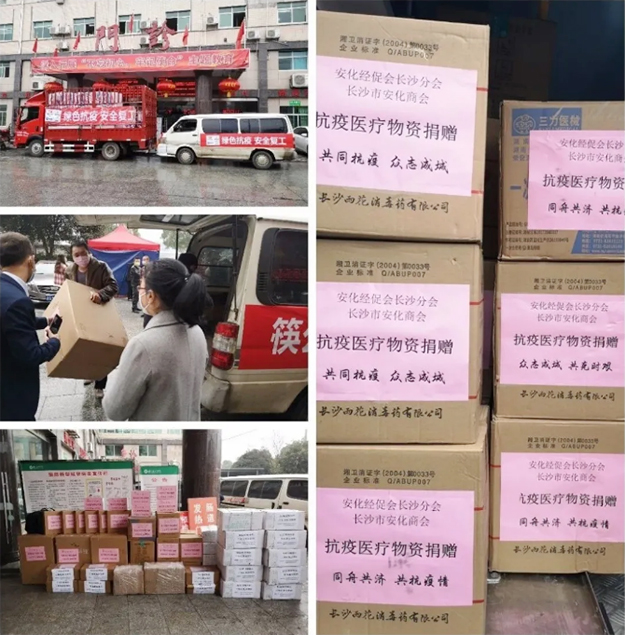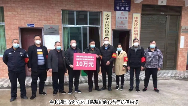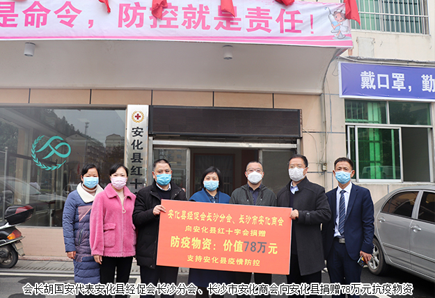 自疫情爆发,安化县经促会长沙分会、长沙市安化商会密切关注安化县疫情发展,得知安化县紧缺医疗防护物资,会长胡国安、执行会长夏晓辉、常务副会长兼轮值会长吴余生等领导快速反应,积极作为,部署秘书处发动会员支援安化。1月30日,安化县经促会长沙分会、长沙市安化商会向会员企业发起“支援安化抗击疫情”的专项募捐活动,倡议各安商积极行动,支援安化,万众一心,抗击疫情。倡议发出后,会员们积极响应,纷纷慷慨解囊,奉献爱心,更有部分会员排除万难,亲自护送物资前往安化,以解安化燃眉之急。2月1日,会长胡国安捐赠价值10万元的韩国KF口罩、医用外科口罩、消毒液、洗护用品等医疗抗疫物资并亲自护送至安化。