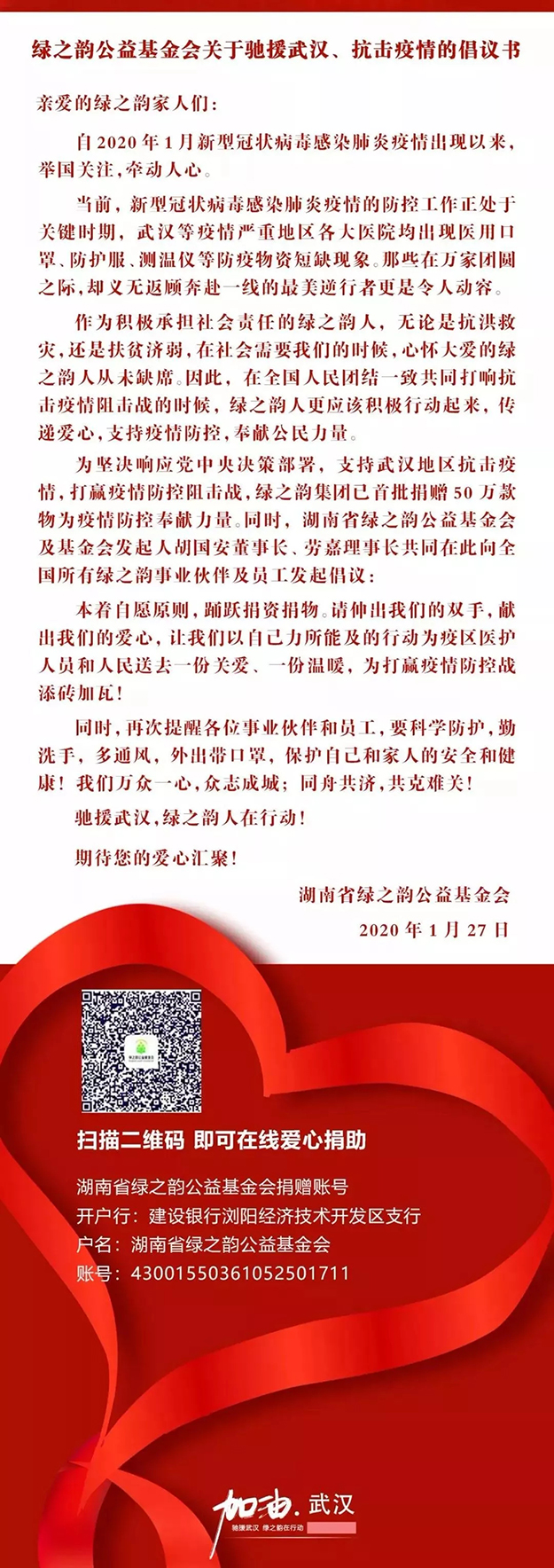▲1月29日,绿之韵碧波庭事业伙伴通过上海慈善基金会向湖北武汉等疫情严重的地方捐赠30万元。1月30日,通过湖南省绿之韵公益基金会追加10万元捐款。