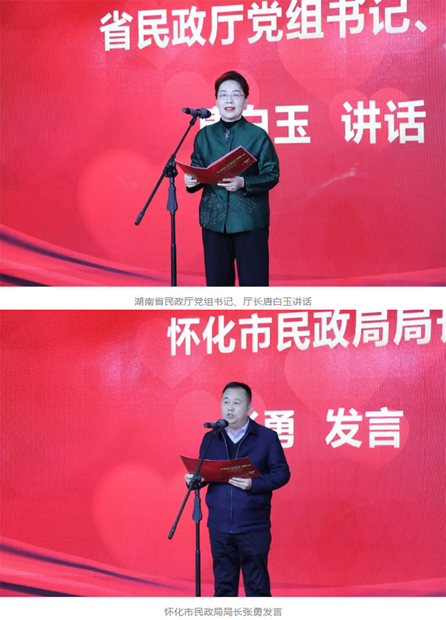 随后,湖南省民政厅党组书记、厅长唐白玉讲话。她首先代表省民政厅向慷慨捐赠的爱心企业致以崇高的敬意,对长期以来关心支持民政事业、关心爱护困难群众的社会爱心人士表示衷心的感谢。她表示,一直以来,省委省政府高度关注困难群众、受灾群众。此次“迎新春送温暖献爱心”活动共筹措资金3.3亿元,预计慰问偏远地区100万贫困户,确保困难群众、受灾群众基本生活得到保障。“迎新春送温暖献爱心”慰问活动承载着党和政府的关怀,希望全省民政部门把开展好这项活动当成当前民生工作的首要任务来抓,公平公正公开地发放好救灾款物,把党的“惠民、利民”工作送到每家每户。她呼吁,希望社会各界共同行动,伸出援助之手、奉献点滴爱心,让困难群众感受大家庭的温暖,共同为全省脱贫攻坚贡献力量。