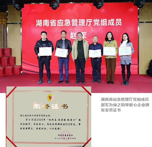 随后,湖南省应急管理厅党组成员赵军为绿之韵等爱心企业颁发荣誉证书。回顾绿之韵十七年爱心之旅,陆续在全国捐建了11所希望小学,打造“关爱贫困母亲”等12大公益品牌,倾情参与100多个公益项目。不断与时俱进,创新公益模式,以更大力度、广度和深度参与教育医疗、爱心赈灾、扶贫帮困等公益事业。截至2019年底,累计捐助款物7000多万元,足迹遍布全国20多个省市和地区,用实际行动履行着企业应尽的责任和义务。此次活动,安博官网继去年捐赠300万爱心物资后,再度向湖南慈善总会捐赠233万元用于对贫困地区困难群众的帮扶慰问,希望能汇聚更多公益力量,号召更多的社会爱心人士共同参与到“迎新春送温暖献爱心”的活动中,为全省打赢脱贫攻坚战、为建设富饶美丽幸福新湖南贡献出自己的力量!