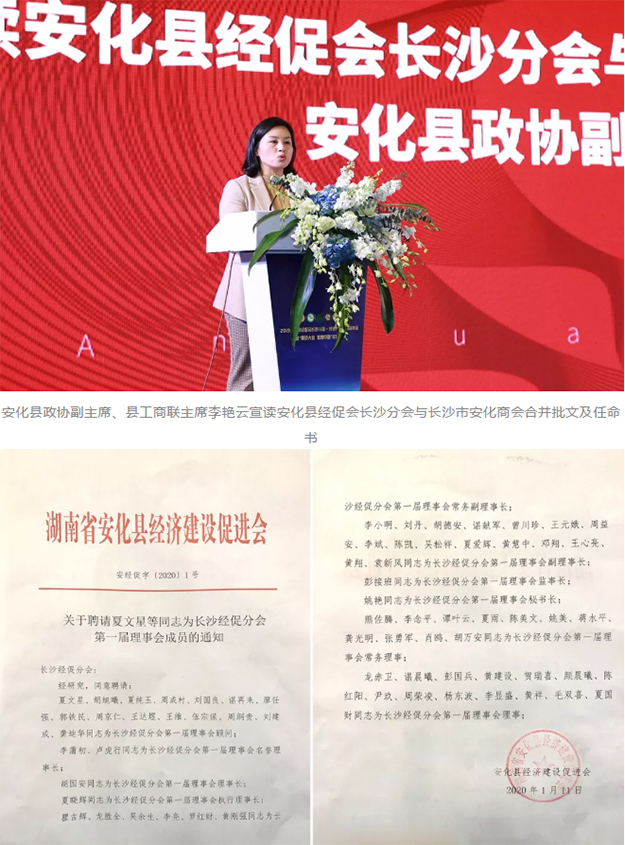 会上,长沙市安化商会轮值会长吴松祥作商会2019年度工作报告;长沙市安化商会监事长彭接班作商会2019年度监事报告;安化县政协副主席、县工商联主席李艳云宣读安化县经促会长沙分会与长沙市安化商会合并批文及任命书。其中,夏文星、胡旭曦等15名同志当选为安化县经促会长沙分会第一届理事会顾问;李蒲初、卢虎行同志当选为安化县经促会长沙分会第一届理事会名誉理事长;胡国安董事长当选安化县经促会长沙分会第一届理事会理事长。
