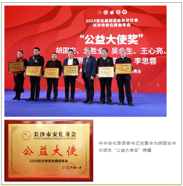 为了表彰为安化发展做出贡献的会员代表,大会相继颁发了“公益大使奖”“优秀会员奖”“优秀副会长奖”“特殊贡献奖”等奖项。胡国安会长积极投身社会公益事业,组织会员参加“情系家乡——安化商会回乡商务考察活动”;回报桑梓,踊跃参与家乡扶贫济困活动,给困难群众送温暖,为精准扶贫工作贡献力量。中共安化县县委书记刘勇会为胡国安会长颁发“公益大使奖”牌匾。