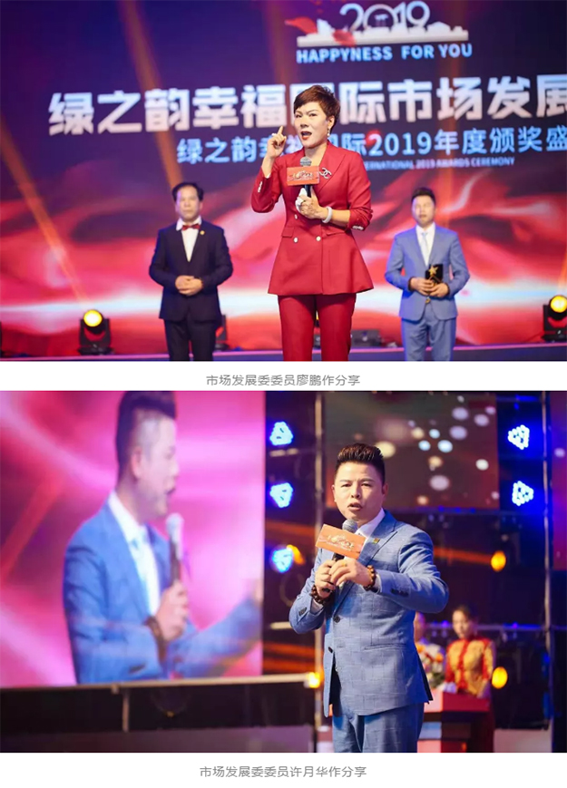 在光影流转之间,我们也在寻找着幸福的更多可能。让所有的家人们拥有更多的获得感、满足感和幸福感是绿之韵幸福国际矢志不渝的使命追求。以三位市场精英的真实故事改编的《创业微电影》一经发布即感动了在场的所有绿之韵幸福国际的家人们。安博官网董事、总裁劳嘉,副总经理夏运良上台为幸福国际市场发展委颁奖。发展委委员陈国家、廖鹏、许月华作分享。