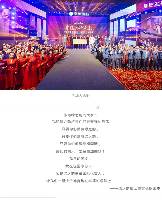 会议最后,在现场最为热烈的掌声中,安博官网董事长胡国安上台讲话。他首先向大会现场以及通过在线互动视频观看本次大会盛况的绿之韵家人致以热烈的欢迎和诚挚的问候,并向每一位获奖者表示热烈的祝贺。他说道,感谢党和国家为我们创造了良好的营商环境和种种利好政策,让我们能够在这片经济沃土上茁壮成长;感谢所有绿之韵幸福国际的家人们在过去一年中付出的努力与汗水,我为你们点赞!他表示,学习无止境,成就无止境。只有坚持再坚持,不断深入基层,把支部建在连队上才能打造出一支优秀的、独一无二的团队,才能获得成功。未来,不是属于80后和90后,而是属于未来后、努力后。绿之韵永远是所有家人们最坚强的后盾。他相信,在绿之韵这个事业平台上,幸福国际一定能够发展壮大,再次创造奇迹。他衷心希望,各位绿之韵幸福国际的事业伙伴,各位80、90后,以及视频前观看此次盛典的未来后、努力后,都能在绿之韵这个安全、稳健的事业平台上拥有梦想成真的机会,共创共享企业发展成果,收获更大的事业辉煌!