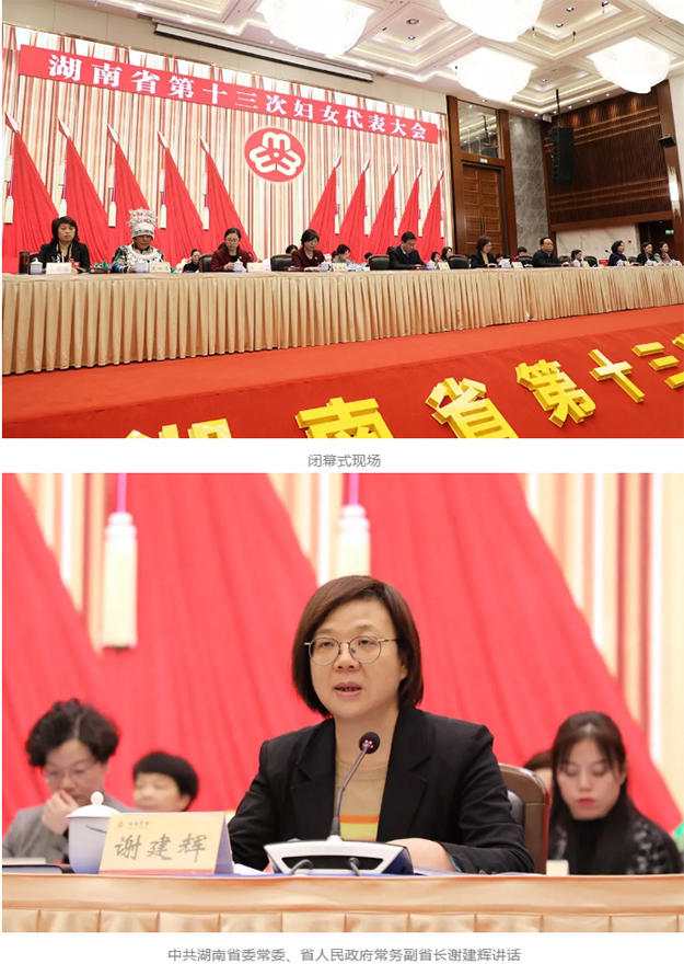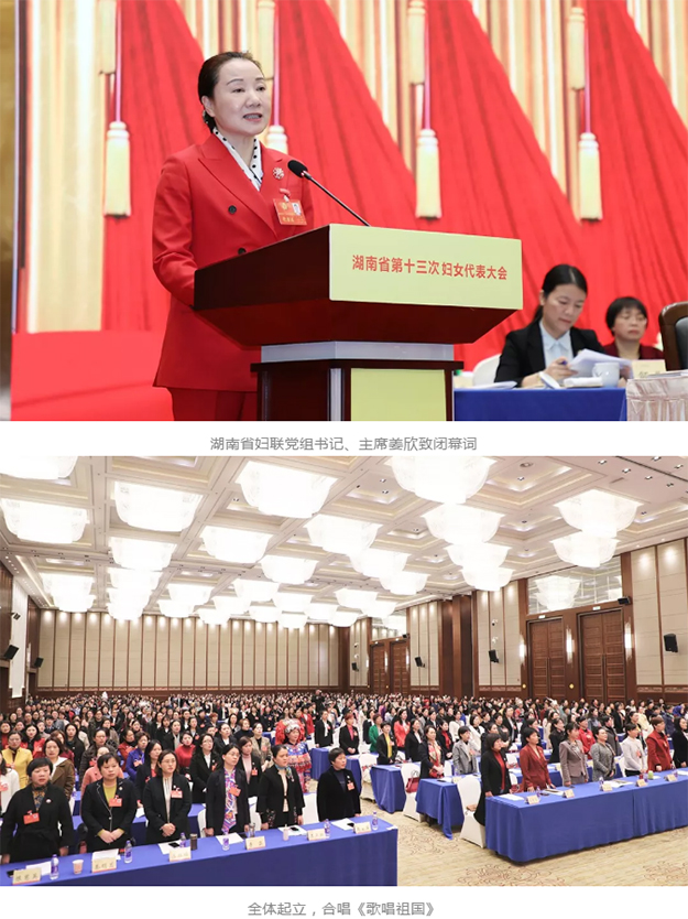闭幕式上,大会宣布了新当选的省妇联第十三届主席、副主席,常务委员名单,通过了《关于湖南省妇联第十二届执行委员会报告的决议》(草案)。姜欣当选湖南省妇联第十三届主席。中共湖南省委常委、省人民政府常务副省长谢建辉代表省委向新当选的省妇联领导班子表示热烈祝贺。她希望,新一届省妇联领导班子立足新起点,抢抓新机遇,团结带领广大妇女开拓进取、扎实工作,奋力谱写湖湘妇女事业发展新篇章。大会在全体妇女代表共同合唱《歌唱祖国》的歌声中落下帷幕。