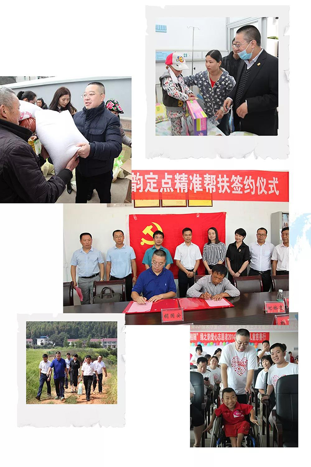 胡国安先生始终将企业社会责任战略聚焦到企业与利益相关方共同发展的相关议题中,在对社会的回馈中释放企业公益的价值,并在最能发挥绿之韵核心优势的领域,为行业、社会关注的希望工程、健康中国、社会养老和脱贫攻坚等重要议题提供力量支撑。截止目前,绿之韵在胡国安先生的带领下,已经踊跃参与了100多项公益慈善项目,项目涉及希望学校、赈灾济困、孤残救助、医疗卫生、修路饮水、社会养老等多个领域,公益足迹覆盖全国13省60多个区县,累计捐赠款物达7000多万元。尤其是近年来,绿之韵在胡国安先生的引领下,通过造血式产业扶贫、支援美丽乡村建设等创新举措,在浏阳市小河乡、安化县黄石片区、湘西龙山县深入开展精准扶贫,赢得了社会各界的好评。胡国安先生先后被中央统战部等五部委评为“全国优秀中国特色社会主义事业建设者”、被中华慈善总会授予“突出贡献奖”、被共青团中央授予“希望杰出贡献奖”,荣获湖南省人民政府颁发的一等功、长沙市人民政府颁发的二等功等荣誉表彰。“精准扶贫”提出五周年之际,2018年10月16日绿之韵被全国工商联、国务院扶贫办评为全国“万企帮万村”精准扶贫行动先进民营企业。湖南政协云、《湘声报》、湖南政协新闻网、新湖南等新闻媒体以《15年公益路,绿之韵的变与不变》为题,聚焦报道了绿之韵精准扶贫、助力攻坚的创新实践历程。