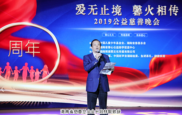 晚会伊始,湖南省慈善总会会长段林毅致辞。他首先对长期关心支持湖南慈善公益事业发展的各位领导、企业家朋友表示衷心的感谢和崇高的敬意。多年来慈善总会汇聚全省的爱心力量,严格落实省委省政府打好脱贫攻坚战的战略部署,聚焦扶贫攻坚,聚焦特殊群众 ,坚持慈善厚德,努力做好慈善捐助、慈善救助的工作。2019年,全省各级慈善机构共募集爱心款物超15亿元,先后帮助困难群众达600多万人次。慈善公益事业是一项伟大的事业,将与时代发展同频共振,需要社会各界大力的参与和支持。他呼吁,全省广大公益组织、企业界爱心朋友、社会爱心人士能更加踊跃积极投身到公益事业中,汇聚湖南力量,创造湖南慈善事业新成就,为打好脱贫攻坚战、全面建成小康社会,实现中华民族伟大复兴的中国梦贡献力量。