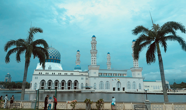 飞抵沙巴的第一天,用过丰富的早餐,家人们便来到了沙巴最著名的水上清真寺——哥达京那巴鲁市立清真寺。它座落在里卡士湾畔(Likas Bay),是一座典型的当代伊斯兰教建筑,也是马来西亚夕阳景观最壮丽的清真寺之一。清真寺建于里卡士湾的人造湖上,清真寺的四座宣礼塔和美丽的穹顶非常引人注目,白色建筑倒映在湖水中,与蔚蓝天色相衬,十分震撼。