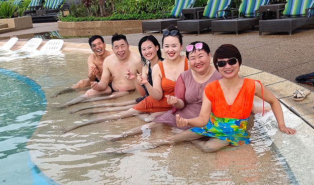 马穆迪岛,是东姑阿都拉曼海岛公园群岛中规模最小的一个岛屿,被誉为“潜水者的天堂”,因其海水清澈见底,水下动植物品种丰富而闻名。在这热情的海岛上,有细白的沙滩以及完全没有污染的天然景色,家人们可以享受清澈见底的海水,感受细腻的白沙从指缝间划过。虽然绿之韵家人们上岛时适逢天下大雨,海上项目都只能取消。但在迷蒙的烟雨中,家人们或是聚在一块交流旅游心得、所见所闻,或是三五成群为第二天的晚宴进行筹备,或是坐在廊下,观赏着雨幕下的马穆迪,亦是别有一番风味。