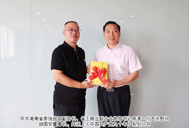 为迎接即将到来的70周年祖国华诞,9月25日下午,中共湖南省委统战部副部长、省工商业联合会党组书记陈潇一行走访慰问“第四届全国优秀中国特色社会主义事业建设者”胡国安董事长,为胡国安董事长送来鲜花与《中国共产党九十年》系列丛书,对胡国安董事长一直以来支持统一战线工作、为湖南社会经济发展作贡献表示感谢并送上节日的祝福。