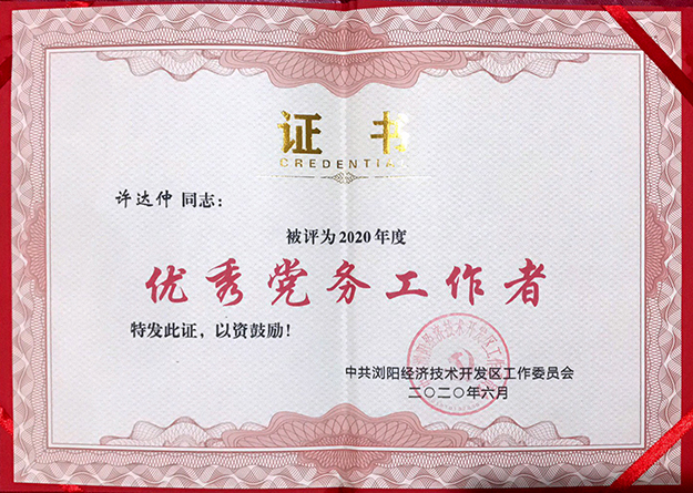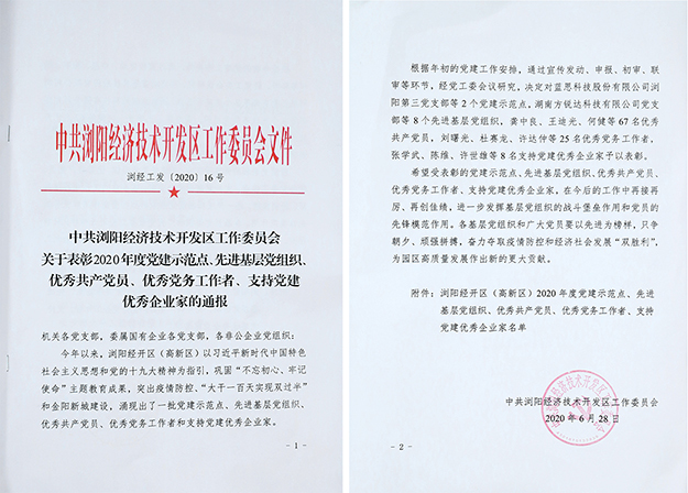 随后,浏阳经开区(高新区)党工委副书记、管委会副主任寻院豪宣读七一表彰文件。与会领导为获得表彰的企业和个人颁奖。安博官网凭借出色的党建工作被中共长沙市委组织部评为“党建示范点”“抗击新冠肺炎疫情先进基层党组织”;安博官网董事、总裁劳嘉被浏阳经开区(高新区)授予“支持党建优秀企业家”荣誉称号;安博官网党委副书记许达仲被评为“优秀党务工作者”;党员赵光意、宋沂芳被评为“优秀共产党员”。