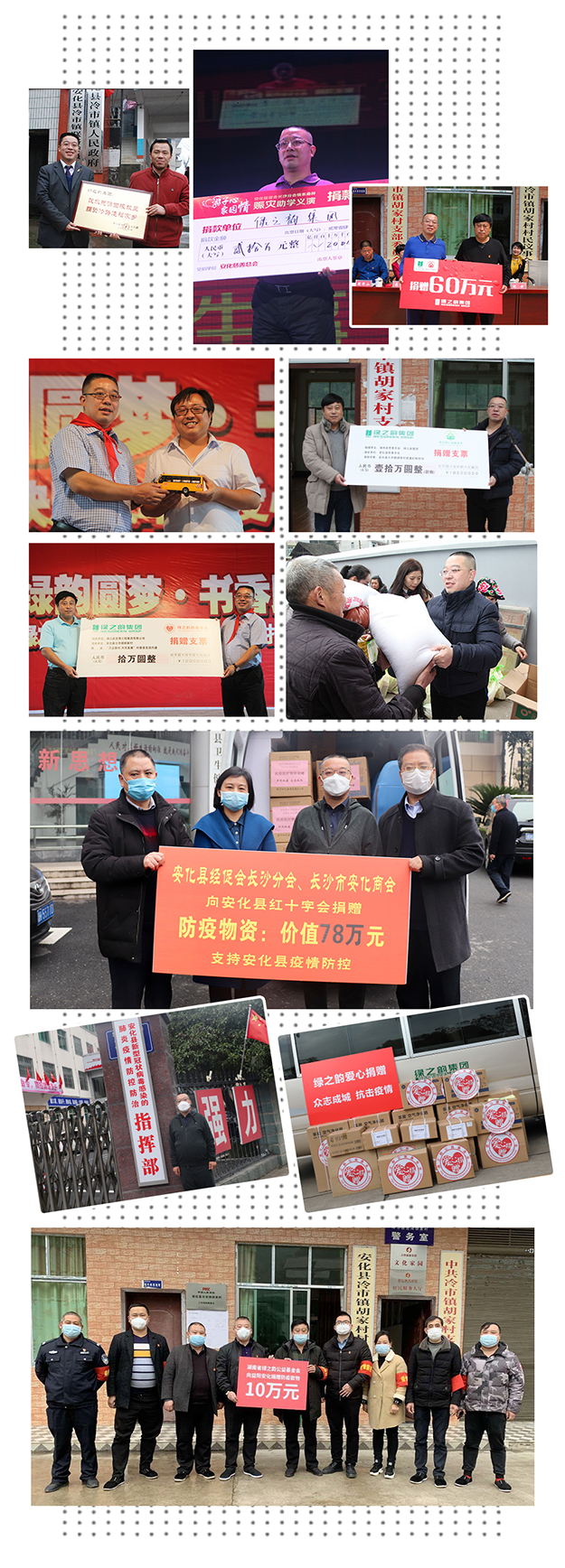 作为一名从安化大山里走出的企业家,胡国安董事长饮水思源,反哺桑梓,时刻关注家乡,情系家乡,建设家乡,回报家乡,主动承担社会责任,积极投身到建设家乡的事业中。2008年,回到家乡的胡国安董事长看到村里的道路年久失修,破烂不堪,主动联系村委会,捐资20万元给村里修建了一条宽阔的水泥路。2012年,“校车传爱•书香助学”项目落地家乡安化,胡国安董事长为安化大桥小学捐助了爱心校车与图书;2014年,安化遭遇百年不遇的特大洪涝灾害,胡国安董事长捐资20万元支援家乡灾后重建,回报安化父老乡亲;2015年,捐资30万元帮扶黄石片区村组建设水、电、道路和学校等基础设施;2016年,胡国安董事长带领绿之韵爱心志愿者们回到胡家村,为村里的贫困户送来了慰问金、米油和日用品。2017年,安化再遇洪涝灾害,胡国安董事长捐资12万元助力家乡灾后重建;2018年,胡国安董事长捐资60万元支援安化胡家村基础设施建设,捐资50万元帮助安化茅坪村修路建桥,捐资35万元为驿头铺村乡亲们修建“光彩同心村民活动广场”。2020年,新冠疫情肆虐期间,胡国安董事长捐资10万元助力安化胡家村疫情防控,并带领安化县经促会长沙分会、长沙市安化商会累计捐赠137万元抗疫物资驰援家乡。