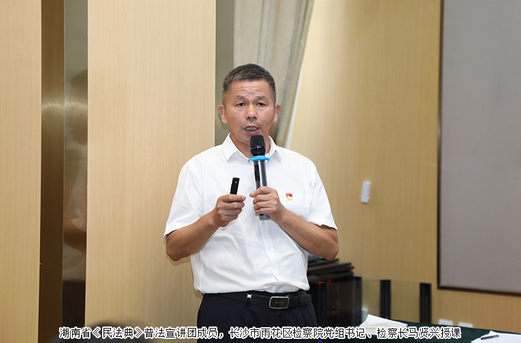 湖南省《民法典》普法宣讲团成员,长沙市雨花区检察院党组书记、检察长马贤兴以“让《民法典》走进人民,走进你我他”为主题,从拥抱《民法典》、学习《民法典》、运用《民法典》三个方面入手,对《民法典》的诚信原则、绿色原则、优良家风、夫妻共同债务、离婚冷静期、土地流转、居住权制度、旧小区加装电梯、未成年人特别保护等与群众日常生活息息相关的法律条文进行了生动、详实的解读。他通过新旧法规变化对比、案例解析,深入浅出解释法律规定,激发了大家主动学习《民法典》的兴趣。马贤兴检察长授课内容言辞幽默、内容殷实、贴近实际,兼具理论性与现实性,员工们听得全神贯注,认真仔细记录讲课要点,不时发出阵阵热烈的掌声。