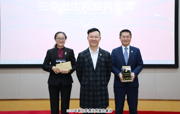 为表彰先进、凝聚力量,进一步激励全体员工的积极性和奋斗激情,大会集中颁发了“三季度优秀服务集体”“三季度服务明星”“五年服务英才奖”“十年服务忠诚奖”等奖项。佣金结算中心、新闻信息中心荣获“2020年第三季度优秀服务集体”称号,喻鸣鸾、靳威、杨邢轩、李向宇、王雪、牛小红、戴明玉、林智文、李思、夏丹、刘伟、李克战、戴明勇、苏铜、肖巧林被评为“2020年第三季度星级优秀员工”,安博官网副总裁刘淑娟、总经理刘维利为获奖部门代表及个人颁奖。肖波、曾梦繁、朱丽妍、张娅、苏妍、陈苗、张煜轩、刘博、吴冬梅、李星丽、牛小红、孟庆玲、袁新星、张琳、邓金林、刘伏海荣膺“五年服务英才奖”,张晓芳、周金霖、盛夏、高素丹、彭姣、高芳荣膺“十年服务忠诚奖”,安博官网董事总裁劳嘉、副总裁胡均安先后上台为获奖员工颁发奖章与荣誉证书,并致以热烈祝贺。“五年服务英才奖”代表肖波和“十年服务忠诚奖”代表周金霖分别发表获奖感言。