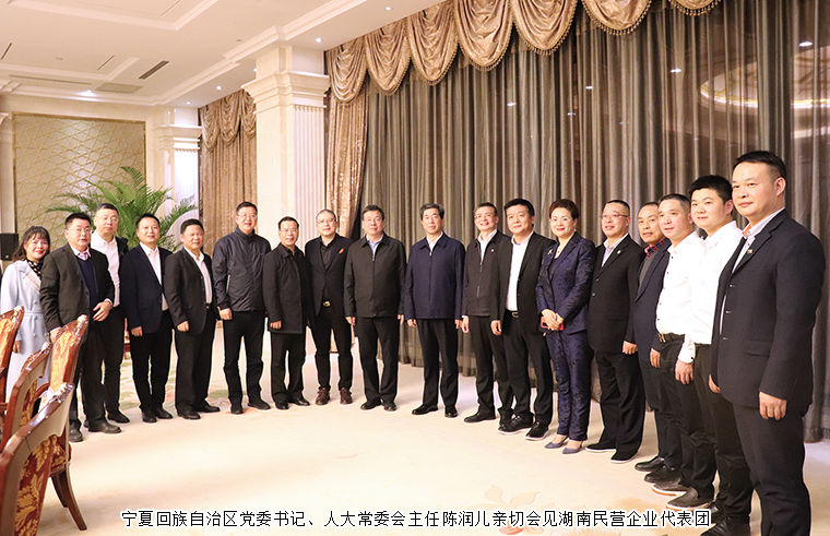 宁夏回族自治区党委书记、人大常委会主任陈润儿亲切会见了湖南民营企业家代表团一行并座谈交流。陈润儿书记与湘籍企业家面对面交流,点对点解答。他表示,湖南民营经济主体活跃度越来越高、创新力越来越强、覆盖面越来越广。宁湘两地在农业、工业制造、环保、冶炼等发展方面各有优势、成就和经验,希望两地以此次考察交流为契机,在以习近平同志为核心的党中央坚强领导下,牢固树立并积极践行新发展理念,以“一带一路”为平台,以创新创业为引领,以共建共赢为导向,进一步加强产业协作,联手进行科技攻关、产学研结合等方面的合作,努力开创交流合作新局面,谱写共同发展新篇章。