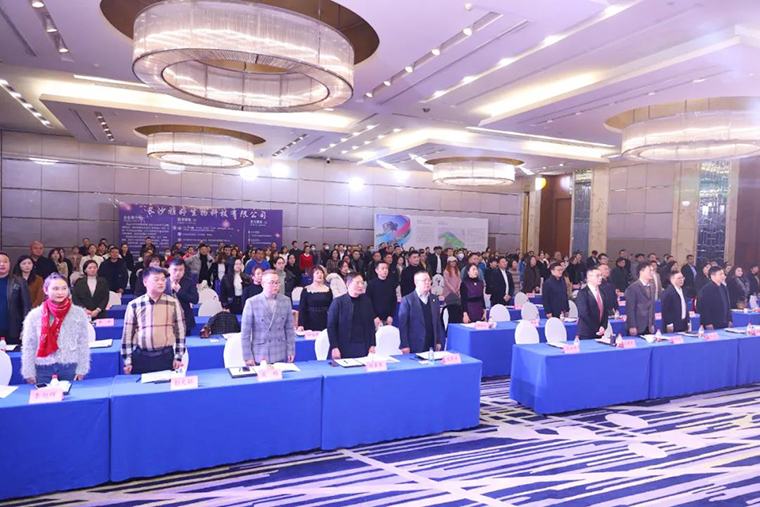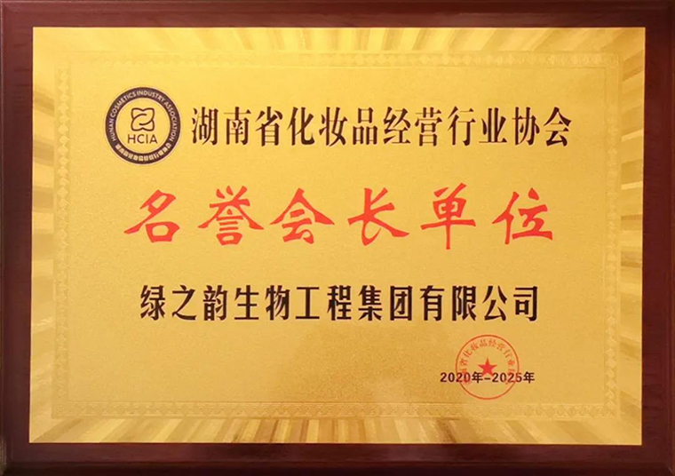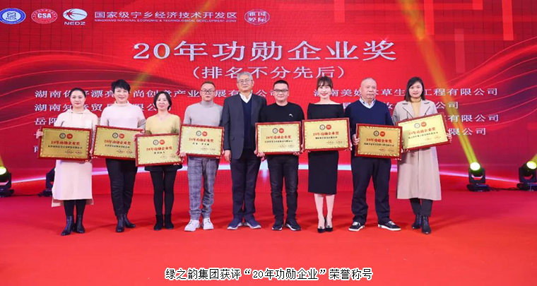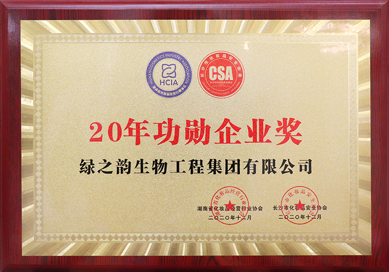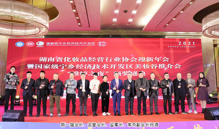 当晚,还举行了湖南省化妆品经营行业协会迎新年会。湖南省化妆品经营行业协会新一届会长、名誉会长、监事长、常务副会长等领导班子成员上台祝酒。晚宴现场为本年度行业内表现突出、取得优异成绩的会员企业颁奖。绿之韵生物工程集团有限公司获评“20年功勋企业”荣誉称号。