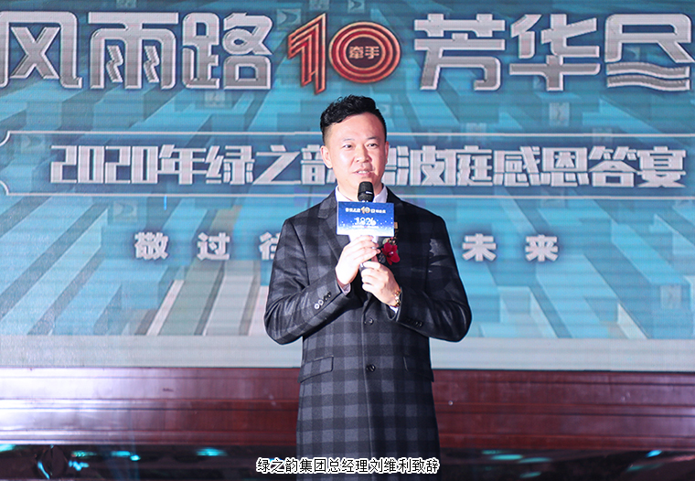 晚宴以“同沐风雨路·芳华尽妖娆”为主题。“同沐风雨路”是致敬绿之韵与碧波庭携手十年走来经历的风雨和青春。“芳华”即庆祝绿之韵碧波庭26周岁的到来。晚宴伊始,安博官网总经理刘维利致辞。他首先代表安博官网向莅临现场的嘉宾领导和市场精英们致以衷心的感谢和诚挚的问候。他表示,2020年我们过得颇不平静,尽管遭遇疫情,但绿之韵仍旧顽强生长,取得了一定的成绩。绿之韵的稳步发展,离不开所有合作伙伴的戮力同心;绿之韵的炫彩绽放,更离不开所有绿之韵碧波庭事业伙伴的鼎力支持。同舟共济扬帆起,乘风破浪万里航,愿我们能继续携手共进,共创美好未来。