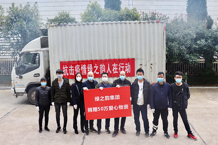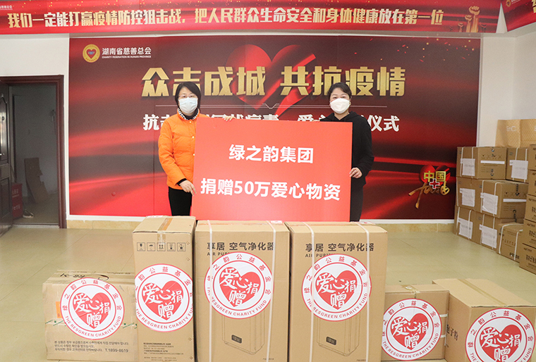 2020年2月13日,绿之韵公益基金会向湖南省慈善总会捐赠价值50万元爱心物资,包括:空气净化器30台、医用酒精消毒液750瓶、韩国KF口罩1000只、KN90口罩2000只、银离子抗菌液500瓶、银离子免洗手消毒液512瓶、螺旋藻300瓶和灵芝孢子粉300盒。