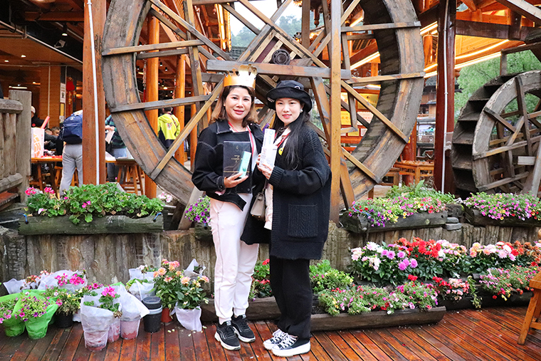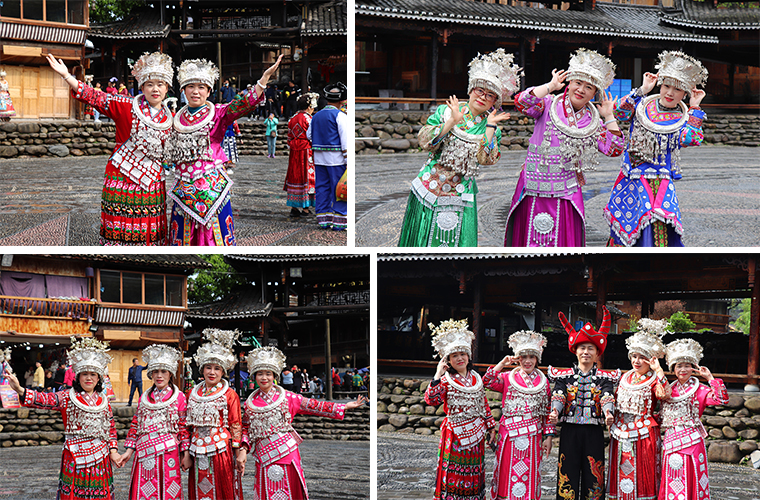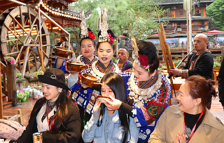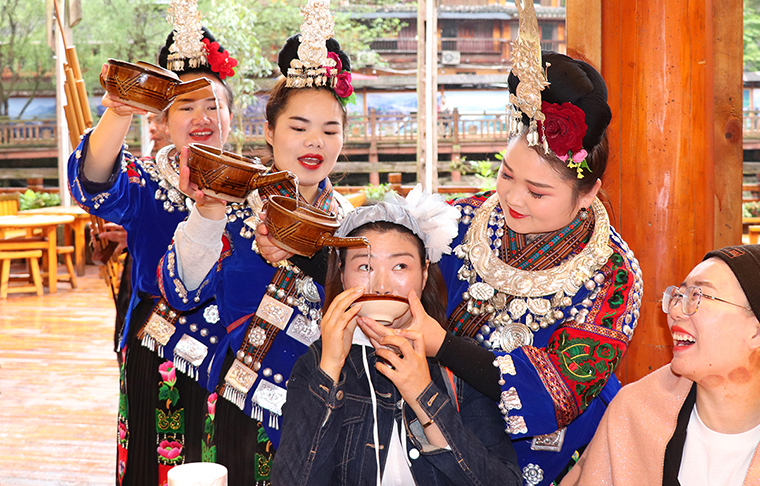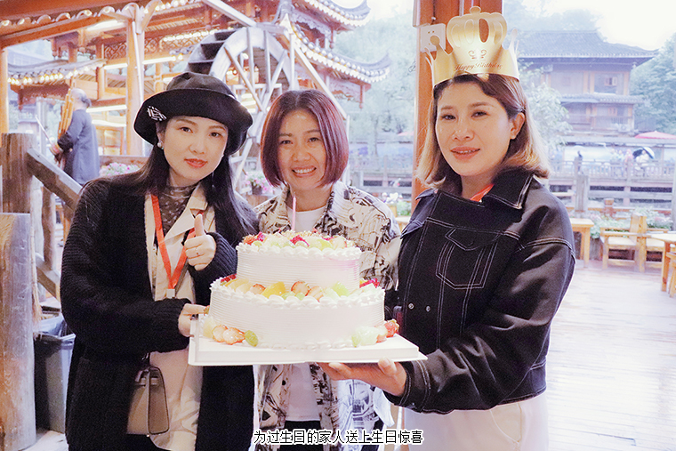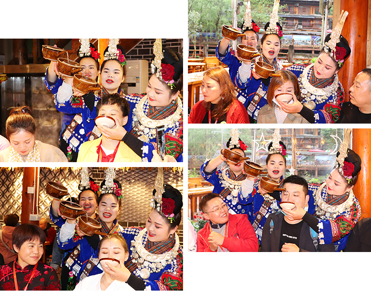 来到苗寨,热情好客的苗族人民为绿之韵家人们准备了长桌宴,苗族传统美食摆满桌面,美味飘香。随后,苗族人民为家人们带来了“高山流水”的民俗表演。苗族阿哥们吹着笙,阿妹们则边唱着迎宾的曲子,拿出盛着米甜酒的牛角,把酒挨个倒进家人们的嘴里,只有饮过此酒才能进去苗寨。当天,适逢两位家人生日,安博官网副总经理梅其慧为过生日的家人准备了生日蛋糕和节日的惊喜大礼。