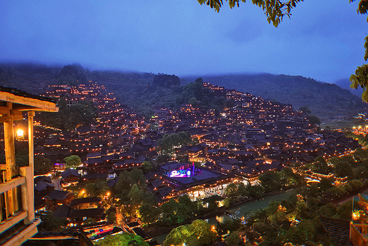 傍晚,虽然下着淅淅沥沥的小雨,但仍然抵挡不住绿之韵家人们观看夜景的激动心情。华灯初上,灯光点亮了山寨,如梦如诉,西江的夜景已经成为贵州的一张旅游名片。家人们在观景台上感受着夜幕下亮起的点点烛火,品味着大山深处的静谧与美好。
