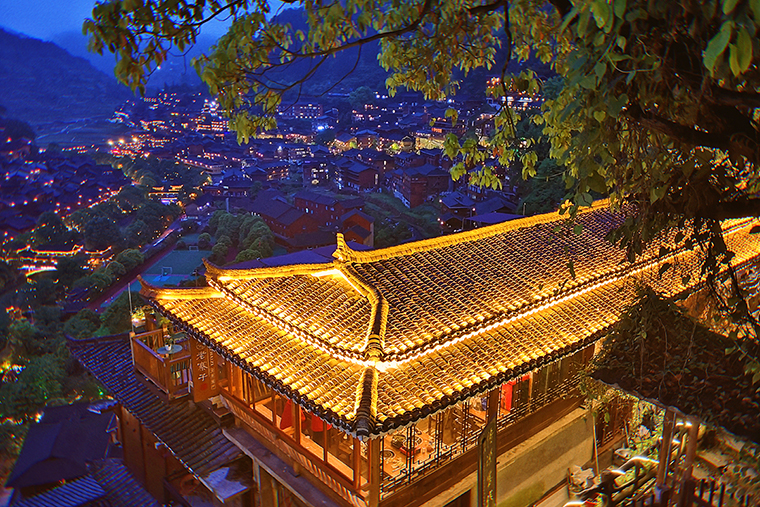 在贵州的大山深处,有着嗜银民族苗族最大的聚居地——西江千户苗寨。西江千户苗寨是全国最大的苗寨,有近千户之多,依山而建的村寨呈牛角形状,房屋多为用枫木搭建而成,依山势向两边展开,暗红色的枫木板壁在夕阳照射下一片金黄。