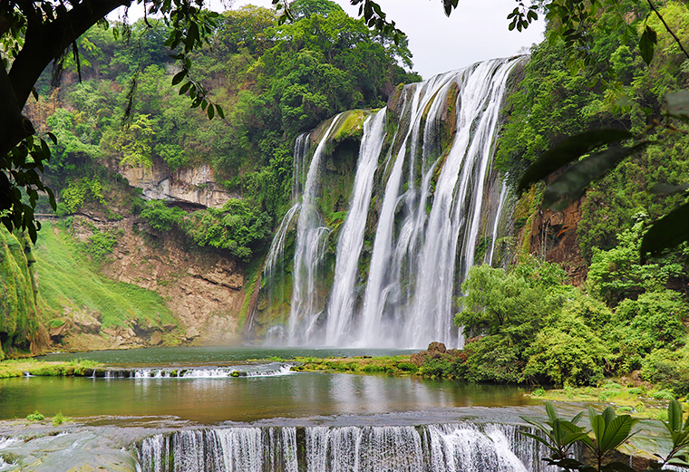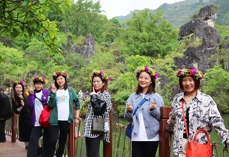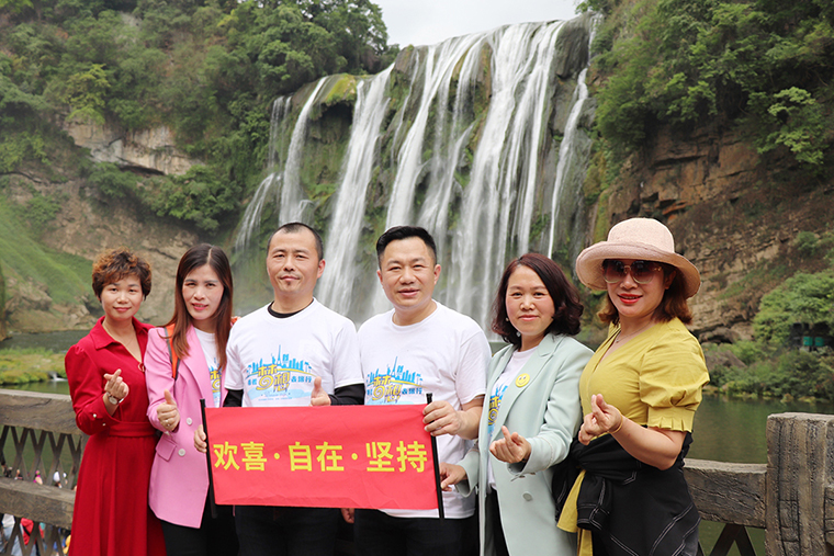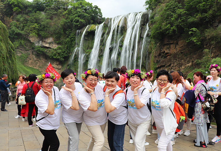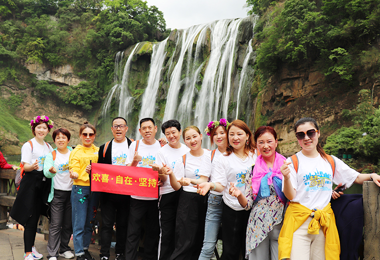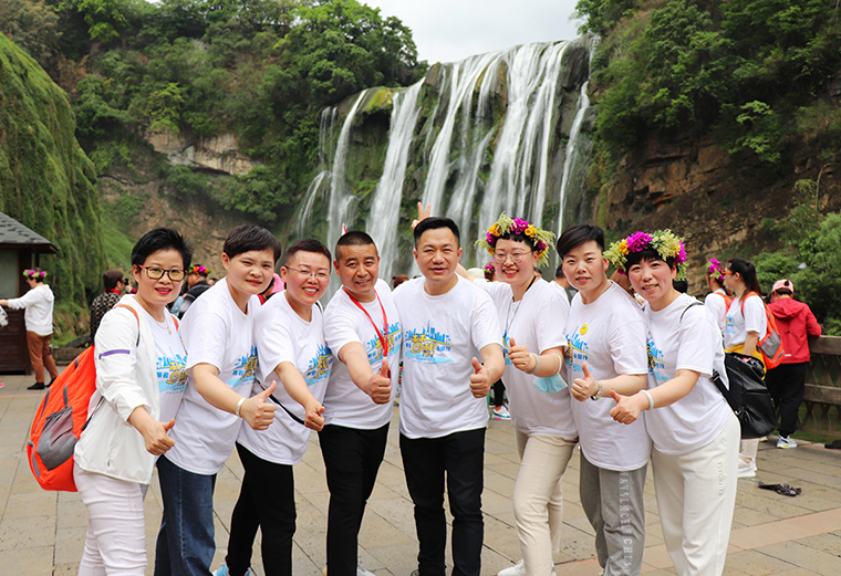 4月27日,绿之韵家人们来到了国家5A级风景区黄果树景区。黄果树景区集石、树、山、水、林、洞为一体,是喀斯特地貌的典型代表。绿之韵家人们首先游览的是黄果树瀑布群中瀑面最宽的陡坡塘瀑布,这里曾是经典电视剧《西游记》中唐僧师徒4人途经高老庄的外景拍摄地。随后,绿之韵家人们来到了亚洲最大的瀑布——黄果树大瀑布。黄果树瀑布高77.8米,主瀑高67米,宽101米,主瀑顶宽83.3米。绿之韵家人们沿着山路而下,听着不绝于耳的水声,瀑布带来的水汽扑面而来。隔得近了,“飞流直下三千尺”的阵势已经通过巨大的水声和远远可见的身影让人深深叹服。远处的瀑布在飞流直下,近处的河流裹夹着山土在汹涌,在旋转,在奔腾向前,河面宽阔,涛涛不绝。