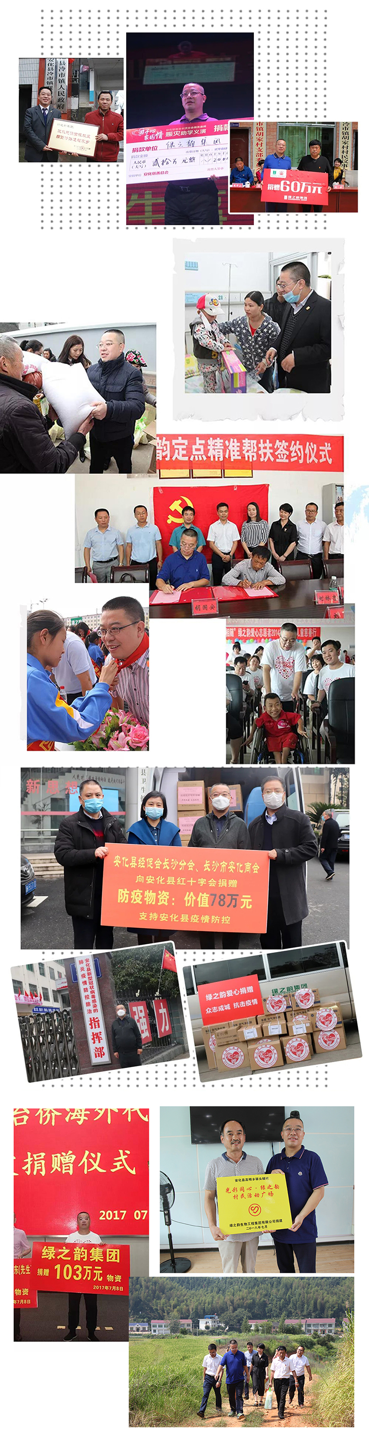 早在2006年,绿之韵便设立了“绿之韵慈善基金”,2015年获省民政厅批准升级为湖南省“绿之韵公益基金会”。并积极与中华慈善总会、湖南省慈善总会、湖南省长沙市光彩事业基金会、长沙市青少年发展基金会、国际关心中国慈善协会(ICC)等机构紧密合作,大力推进公益扶贫项目,建立常规化公益援助机制。截止目前,安博官网已经累计捐建了11所希望学校,踊跃参与和捐助了100多项品牌公益慈善项目,项目涉及赈灾济困、兴教助学、孤残救助、医疗卫生、修路饮水、养老医疗等多个领域,累计捐款捐物7000多万元。除了大力参与赈灾、抗疫、扶贫、帮困等社会慈善事业之外,还积极开展关爱贫困母亲、绿韵圆梦书香助学、关爱孤残儿童、“绿跑”大型公益计划等具有绿之韵品牌和社会影响力的公益活动。