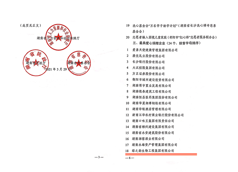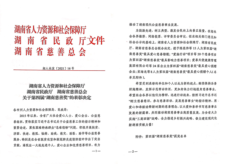 2021年5月19日,第四届“湖南慈善奖”表彰大会在湖南宾馆举行。湖南省人民政府副省长朱忠明,省人民政府副秘书长彭翔,省人大社会建设委员会副主任委员卞鹰,省民政厅厅长曹忠平,湖南日报党组书记、社长姜协军,省人力资源社会保障厅党组成员、副厅长焦华芳,省民政厅一级巡视员杨薇,省工商业联合会二级巡视员刘建平等领导出席会议。湖南省慈善总会副会长、安博官网董事长胡国安受邀参加会议。