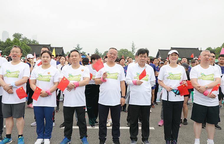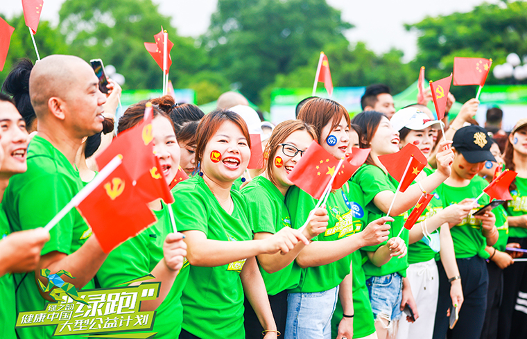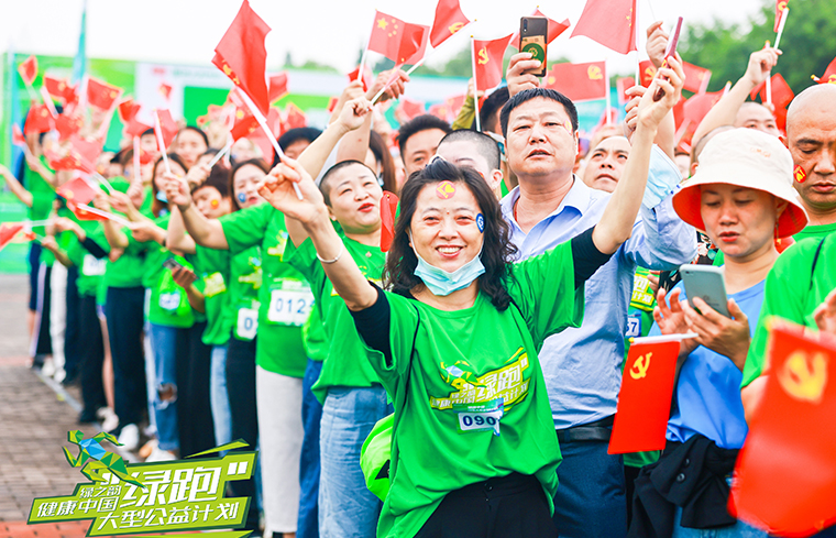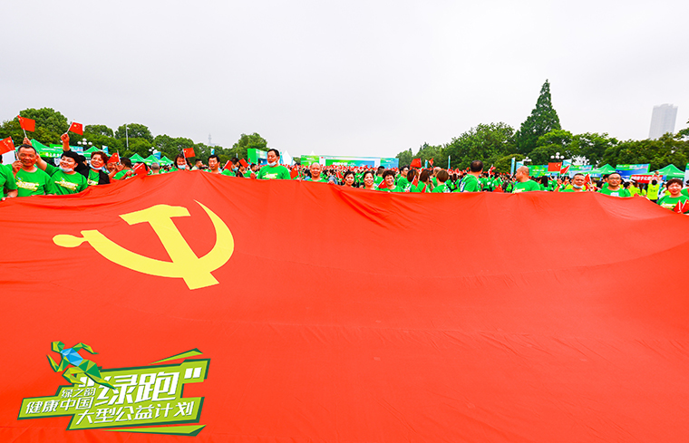 起跑前,绿跑还举行了盛大的传旗仪式。“绿跑侠”们纷纷伸出自己的双手传递旗帜往前走,当书写着“健康中国·绿跑”六个大字的主题大旗从人群头顶传过,在绿跑队伍中迅速传递时,全场欢呼声与掌声此起彼伏。