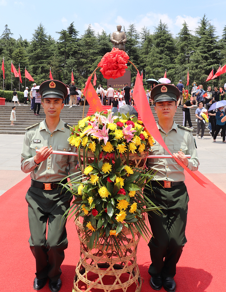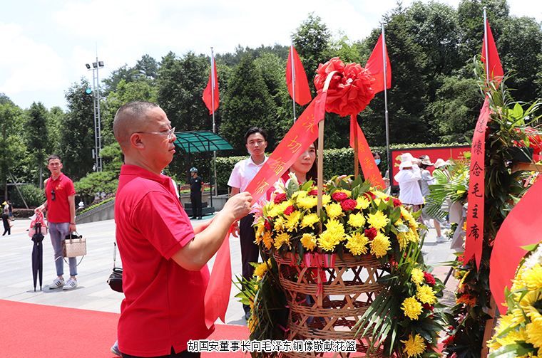在现场工作人员的带领下,一行人来到毛泽东铜像广场,瞻仰伟大的毛主席。毛主席铜像立于高高的红色花岗岩石基座上,背靠韶峰,主席身躯伟岸,手握书卷,双眼炯炯有神,面带微笑地注视远方。大家表情庄严肃穆,整齐有序地排着队列,怀着无比崇敬的心情,向毛主席铜像敬献花篮,每个人都自发自觉地用自己的方式怀念着这位伟大的领袖。
