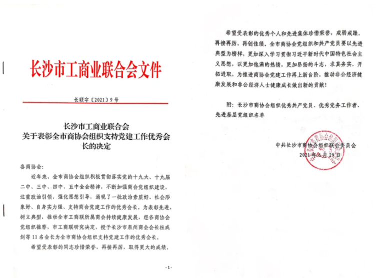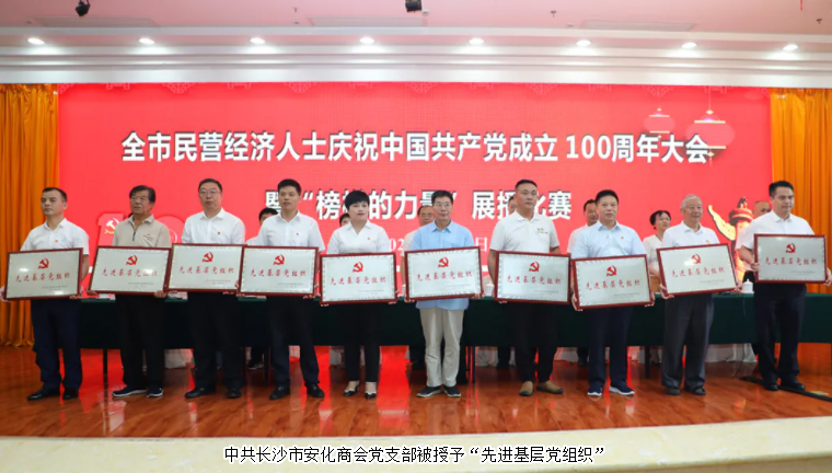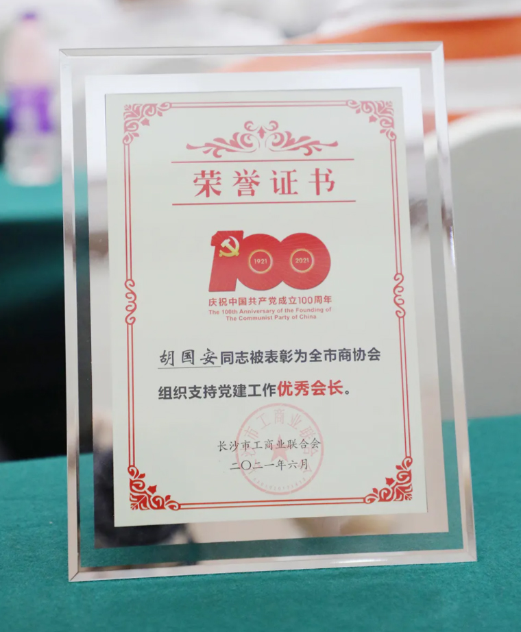 随后,现场举行了盛大的颁奖仪式。对长沙市商协会组织优秀共产党员、优秀党务工作者、先进基层党组织和支持党建工作优秀会长进行了表彰。长沙市安化商会会长、安博官网董事长胡国安被长沙市工商业联合会授予“全市商协会组织支持党建工作优秀会长”荣誉称号;中共长沙市安化商会党支部被授予“先进基层党组织”。