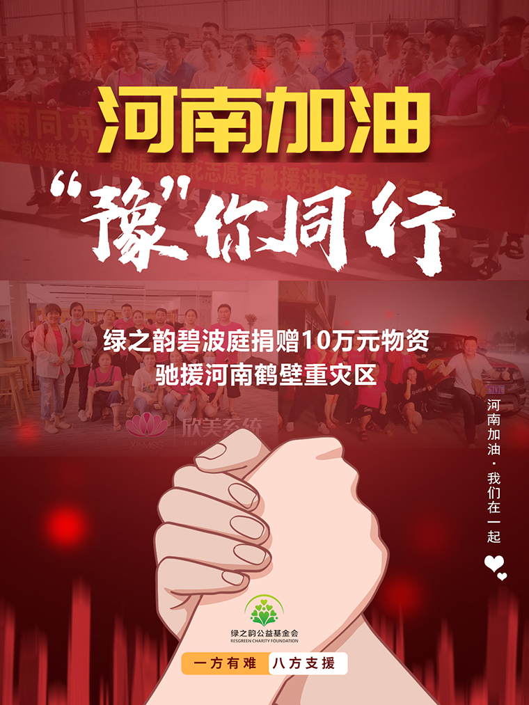 碧见真情,“豫”你同行。一声加油,一种温暖。绿之韵将持续关注河南各地灾情,与当地事业伙伴和爱心志愿者送去力所能及的帮助。我们相信,只要大家团结一致,有力、有序、有效地开展防汛救灾工作,定能共同夺取此次防汛救灾的最后胜利。加油!河南的同胞们,我们一直与你们在一起!
