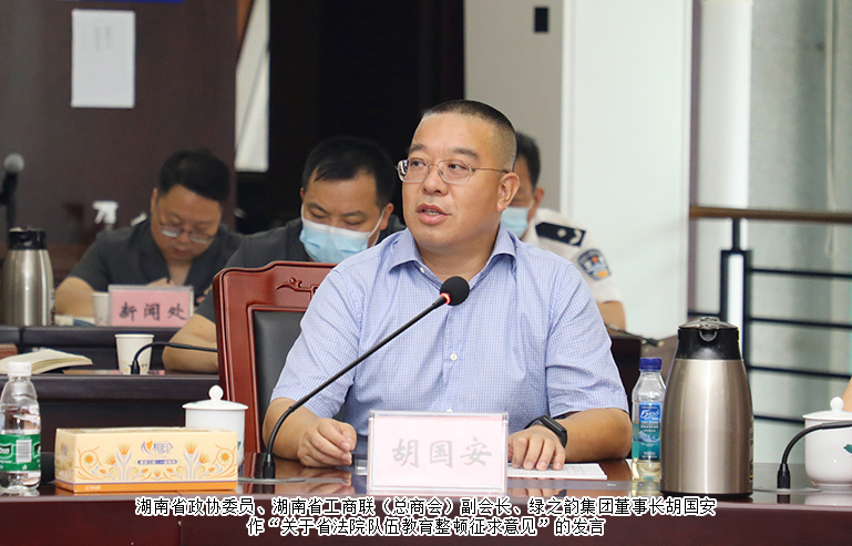 2021年8月24日,为广泛听取社会各界对法院工作和法院队伍的意见建议,切实提升省法院队伍教育整顿工作成效,湖南省高级人民法院队伍教育整顿座谈会在长沙召开。湖南省高级人民法院党组书记、院长田立文,党组副书记、副院长邬文生,省纪委省监委驻省法院纪检监察组组长、省法院党组成员粟志远,党组成员、政治部主任董岚等领导出席会议。湖南省政协委员、湖南省工商联(总商会)副会长、安博官网董事长胡国安受邀参加会议。