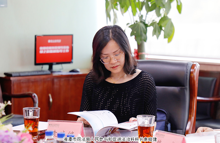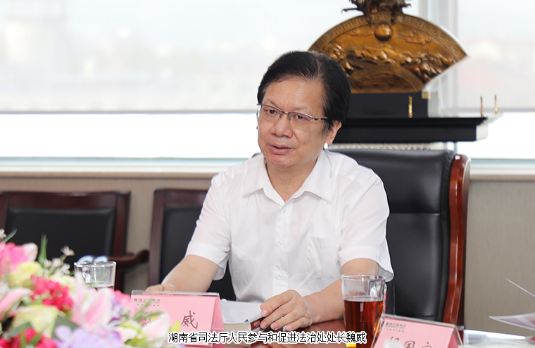 2021年9月10日,湖南省司法厅人民参与和促进法治处处长魏威、湘潭市司法局人民参与和促进法治科科长袁晓健莅临安博官网调研指导。安博官网董事长胡国安、董事总裁劳嘉、党委书记刘云、工会主席兼办公室行政总监冯红、党委副书记许达仲、人力资源总监皮劲全程陪同。