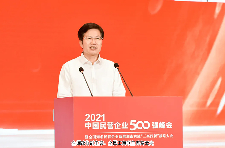全国政协副主席、全国工商联主席高云龙在致辞中指出,在庆祝中国共产党成立100周年大会上,习近平总书记擘画了全面建成社会主义现代化强国的第二个百年奋斗目标,让广大民营经济人士无比振奋、信心倍增,激发出了民营企业开拓进取、再创辉煌的强大力量。当前,我国发展已经进入新阶段,500强企业作为民营经济蓬勃发展的亲历者,要立足两个大局,完整、准确、全面贯彻新发展理念,用知重负重、攻坚克难的实际行动,在实现中华民族伟大复兴的新征程中建功立业。